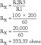 For example, in figure 1-5, we know that R1 is 60 ohms, R2 is 100 ohms, and R3 is 200 ohms. To find the value of R x, we can use our formula as follows: