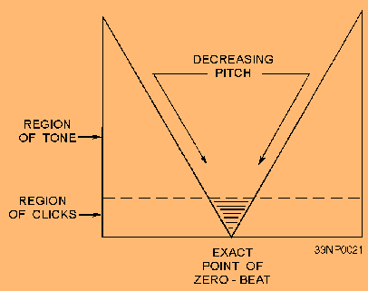 For all practical purposes, the point of zero beat can be assumed when the clicks are heard at infrequent intervals. Figure 2-10 illustrates the zero-beat concept. Maintaining a condition of absolute silence in the earphones is extremely difficult when you are making this measurement. When the incoming signal is strong, the clicks are sharp and distinct. When the signal is weak, the zero-beat condition is evidenced by a slowly changing "swishing" or "rushing" sound in the headset. After the zero beat is obtained, the dial reading corresponds to the frequency measured. Figure 2-10. - Graph of sound observed in earphone when zero beating.