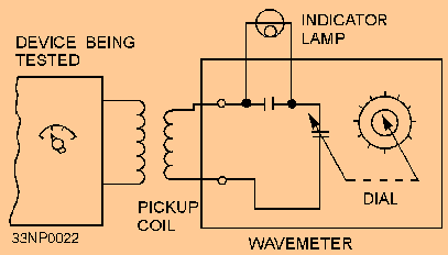 The manufacturer's calibration book is a very important part of the frequency meter package; in fact, the book is so important that it bears the same serial number as the heterodyne-type frequency meter itself. Contained in this book is a list of the dial settings and the corresponding frequencies produced by that meter at those dial settings. Operating instructions for the meter are also included. Absorption Wavemeter WAVEMETERS are calibrated resonant circuits used to measure frequency. The accuracy of wavemeters is not as high as that of heterodyne-type frequency meters; however, they have the advantage of being comparatively simple and can be easily carried. Q.8 What equipment uses a calibrated resonant circuit to measure frequency? Any type of resonant circuit can be used in wavemeter applications. The exact kind of circuit used depends on the frequency range for which the meter is intended. Resonant circuits consisting of coils and capacitors are used for VLF through VHF wavemeters. The simplified illustration of an absorption wavemeter, shown in figure 2-11, consists of a pickup coil, a fixed capacitor, a lamp, a variable capacitor, and a calibrated dial. When the wavemeter's components are at resonance, maximum current flows in the loop, illuminating the lamp to maximum brilliance. The calibrated dial setting is converted to a frequency by means of a chart, or graph, in the instruction manual. If the lamp glows very brightly, the wavemeter should be coupled more loosely to the circuit. For greatest accuracy, the wavemeter should be coupled so that its indicator lamp provides only a faint glow when tuned to the resonant frequency. Figure 2-11. - Absorption wavemeter circuit.