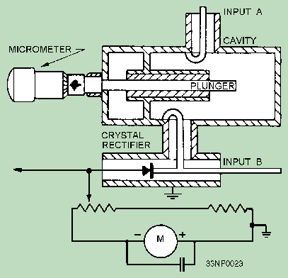 FREQUENCIES ABOVE THE AUDIO RANGE The signal frequencies of radio and radar equipments that operate in the UHF and SHF ranges can be measured by resonant, cavity-type wavemeters or resonant, coaxial-line-type wavemeters. When properly calibrated, resonant-cavity and resonant-coaxial line wavemeters are more accurate and have better stability than wavemeters used for measurements in the LF to VHF ranges. These frequency-measuring instruments are often furnished as part of the equipment. They are also available as general-purpose test sets. Although many wavemeters are used in performing various functions, the cavity-type wavemeter is the type most commonly used. Only this type is discussed in some detail. Cavity Wavemeter Figure 2-12 shows a typical CAVITY WAVEMETER. The wavemeter is of the type commonly used for the measurement of microwave frequencies. The device uses a resonant cavity. The resonant frequency of the cavity is varied by means of a plunger, which is mechanically connected to a micrometer mechanism. Movement of the plunger into the cavity reduces the cavity size and increases the resonant frequency. Conversely, an increase in the size of the cavity (made by withdrawing the plunger) lowers the resonant frequency. The microwave energy from the equipment being tested is fed into the wavemeter through one of two inputs, A or B. The crystal rectifier then detects (rectifies) the signal. The rectified current is indicated on current meter M. Figure 2-12. - Typical cavity wavemeter.