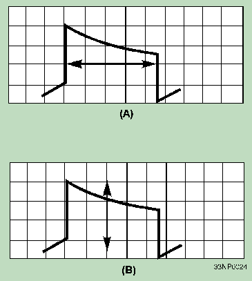 USE OF THE OSCILLOSCOPE The CATHODE-RAY OSCILLOSCOPE (CRO or O-SCOPE) is commonly used for the analysis of waveforms generated by electronic equipment. Several types of cathode-ray oscilloscopes are available for making waveform analysis. The oscilloscope required for a particular test is determined by characteristics, such as input-Frequency response, input impedance, sensitivity, sweep rate, and the methods of sweep control. The SYNCHROSCOPE is an adaptation of the cathode-ray oscilloscope. It features a wide-band amplifier, triggered sweep, and retrace blanking circuits. These circuits are desirable for the analysis of pulse waveforms. Oscilloscopes are also part of some harmonic analysis test equipments that display harmonic energy levels. To effectively analyze waveform displays, you must know the correct wave shape. The maintenance instructions manual for each piece of equipment illustrates what waveforms you should observe at the various test points throughout the equipment. Waveforms that will be observed at any one selected test point will differ; each waveform will depend on whether the operation of the equipment is normal or abnormal. The display observed on a cathode-ray oscilloscope is ordinarily one similar to those shown in figure 2-13. Views A and B show the instantaneous voltage of the wave plotted against time. Elapsed time (view A) is indicated by horizontal distance, from left to right, across the etched grid (graticule) placed over the face of the tube. The amplitude (view B) of the wave is measured vertically on the graph. Figure 2-13. - Typical waveform displays.