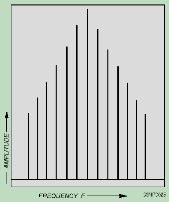 The oscilloscope is also used to picture changes in quantities other than simply the voltages in electric circuits. For example, if you need to see the changes in waveform of an electric current, you must first send the current through a small resistor. You can then use the oscilloscope to view the voltage wave across the resistor. Other quantities, such as temperatures, pressures, speeds, and accelerations, can be translated into voltages by means of suitable transducers and then viewed on the oscilloscope. A detailed discussion of the oscilloscope is presented in chapter 6 of this module. USE OF THE SPECTRUM ANALYZER The SPECTRUM ANALYZER is a device that sweeps over a band of frequencies to determine (1) what frequencies are being produced by a specific circuit under test and (2) the amplitude of each frequency component. To accomplish this, the spectrum analyzer first presents a pattern on a display. Then the relative amplitudes of the various frequencies of the spectrum of the pattern are plotted (see figure 2-14). On the vertical, or Y axis, the amplitudes are plotted; on the horizontal, or X axis, the frequencies (time base) are plotted. The overall pattern of this display indicates the proportion of power present at the various frequencies within the SPECTRUM (fundamental frequency with sideband frequencies). Figure 2-14. - Spectrum analyzer pattern.