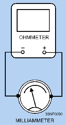 Voltage Checks Voltage measurements provide a means of checking circuit conditions in a transistorized circuit just as they do in checking conditions in a tube circuit. The voltages, however, are much lower than in a tube circuit. The bias voltage between the base and emitter, for instance, is usually 0.05 to 0.20 volts. When making checks, observe polarity. Resistance Checks Transistors have little tendency to burn or change value because of low voltage in their circuits. They can, however, be permanently damaged by high-voltage conditions that occur when the collector voltage is increased. They can also be permanently damaged when the ambient temperature increases and causes excessive collector current flow. Transistors are easily damaged by high current; therefore, resistance measurements must not be taken with an ohmmeter that provides a maximum current output in excess of 1 milliampere. If you are not sure that the range of ohmmeter you want to use is below the 1 milliampere level, connect the ohmmeter to a milliammeter and check it. See figure 2-19 for a method of measuring the current from an ohmmeter. Figure 2-19. - Measuring current passed by an ohmmeter.