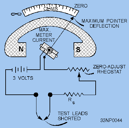 Q.21 What added features enable a dc milliammeter to function as an ohmmeter? The deflection of the pointer of an ohmmeter is controlled by the amount of battery current passing through the moving coil. Before you can measure the resistance of an unknown resistor or electrical circuit, you must calibrate the ohmmeter to be used. If the value of resistance to be measured can be estimated within reasonable limits, select a range on the ohmmeter that will give approximately half-scale deflection when the resistance is inserted between the probes. If you cannot estimate the resistance to be measured, then set the range switch on the highest scale. Whatever range you select, the meter must be calibrated to read zero before the unknown resistance is measured. To calibrate the meter, you first short the test leads together, as shown in figure 3-12. With the test leads shorted, a complete series circuit exists. The complete series circuit consists of the 3-volt source, the resistance of the meter coil (R m), the resistance of the zero-adjust rheostat, and the series multiplying resistor (Rs). The shorted test leads cause current to flow and the meter pointer to deflect. Notice that the zero point on the ohmmeter scale (as opposed to the zero points for voltage and current) is located at the extreme right side of the scale. With the test leads shorted, the zero-adjust potentiometer is set so that the pointer rests on the zero mark. Therefore, a full-scale deflection indicates zero resistance between the leads. Q.22 A full-scale deflection on an ohmmeter scale indicates what resistance between the