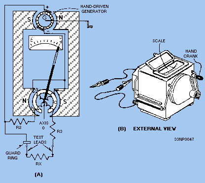 ohmmeter. This potential is placed between the conductor and the outside of the insulation. A megger (megohmmeter) is used for these tests. The megger, shown in figure 3-15, is a portable instrument consisting of two main elements: (1) a hand-driven dc generator, which supplies the necessary voltage for making the measurement, and (2) the instrument portion, which indicates the value of the resistance you are measuring.">
