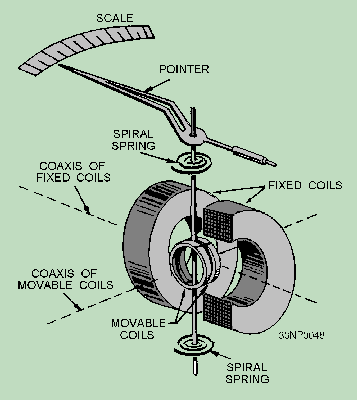 field? As shown in figure 3-16, the fixed coils are connected in series and positioned coaxially (in line) with a space between them. The two movable coils are also positioned coaxially and are connected in series. The two pairs of coils (fixed pair and movable pair) are also connected in series with each other. The movable coil is pivot-mounted between the fixed coils. The main shaft on which the movable coils are mounted is restrained by spiral springs that restore the pointer to zero when no current is flowing through the coil. These springs also act as conductors for delivering current to the movable coils. Since these conducting springs are very small, the meter cannot carry a high value of current. Figure 3-16. - Internal construction of an electrodynamometer.