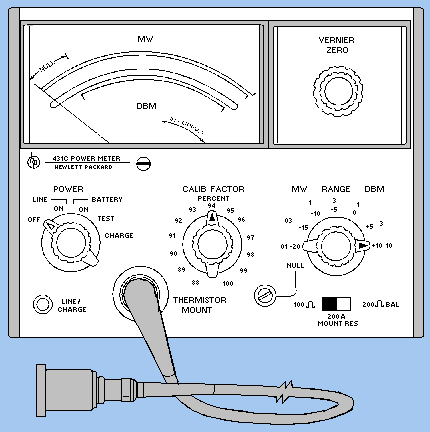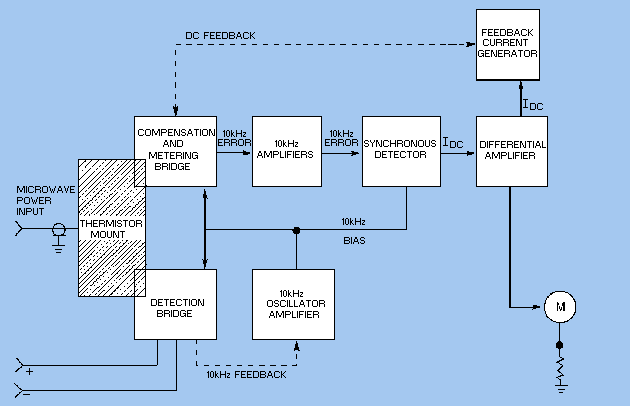 The HP-431C power meter indirectly measures microwave frequency power by using two bridge circuits - the detection bridge and the compensation and metering bridge. The detection bridge incorporates a 10-kilohertz (kHz) oscillator in which the amplitude is determined by the amount of heating of the thermistors in that bridge caused by microwave power. (Thermistors were covered in chapter 2 of this module.) The compensation and metering bridge contains thermistors that are affected by the same microwave power heating as those of the detection bridge. An unbalance in the metering bridge produces a 10-kHz error signal. This error signal, plus the 10-kHz bias that is taken directly from the 10-kHz OSCILLATOR-AMPLIFIER, is mixed in the SYNCHRONOUS DETECTOR. The synchronous detector produces a dc current (Idc) that is proportional to the 10-kHz error signal. The Idc error signal is fed back to the compensation and metering bridge, where it substitutes for the 10-kHz power in heating the thermistor and drives the bridge toward a state of balance. The dc output of the synchronous detector also operates the meter circuit for a visual indication of power. Q.2 What condition produces the 10-kHz error signal generated by the metering bridge in