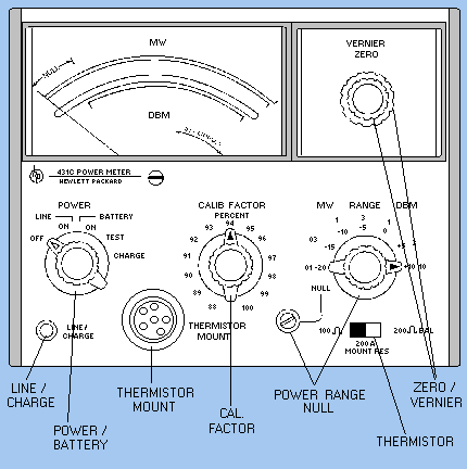 that the arrow indicating power flow points toward which end of the transmission line? Reflected power is measured in the same manner as described for incident power, except that the coupler-detector is rotated so that the arrow points toward the rf source. After completing power measurements, de-energize the rf source, disconnect the wattmeter from the transmission line, and place the wire shunt on the meter terminals. Interpreting Power Measurements Made by the Wattmeter The rf power measurements made by the wattmeter are used to determine the voltage standing wave ratio (VSWR) of the load and the power absorbed by the load. (VSWR is covered in NEETS, Module 10, Introduction to Wave Propagation, Transmission Lines, and Antennas.) The VSWR can be determined from a chart provided in the wattmeter technical manual, or it can be calculated (as shown in the following example for a UHF transmitter) by the formula below (Pi is the incident power, and Pr is the reflected power as measured by the wattmeter): Where: Pi = 30 watts The example above results in a standing wave ratio expressed as 1.3 to 1. In a perfectly matched transmission line where there is no reflected power (Pr = 0), the standing wave ratio would be 1 to 1. A standing wave ratio of 1.5 to 1 indicates a 5-percent reflection of energy (loss) and is considered to be the maximum allowable loss. So, our example is within allowable limits. If the standing wave ratio is greater than 1.5 to 1, then the transmission line efficiency has decreased and troubleshooting is necessary. An excellent discussion of the reasons for standing wave ratio increases is presented in EIMB, Test Methods and Practices, NAVSEA 0967-LP-000-0130. You can determine the rf power absorbed by the load simply by subtracting the reflected power reading from the incident power reading made by the wattmeter (30 watts - 0.5 watts = 29.5 watts). The power meter just discussed is often described as an IN-LINE POWER METER because readings are taken while the power meter is connected in series with the transmission line. Another type of power meter used by the Navy measures power indirectly. An example of an indirect-measuring power meter is described in the next section. INDIRECT-MEASURING POWER METERS An example of an indirect-measuring power meter is the HP-431C, shown in figure 5-2. The controls, connectors, and indicators for the power meter are illustrated in figure 5-3. This power meter can be operated from either an ac or dc primary power source. The ac source can be either 115 or 230 volts at 50 to 400 hertz. The dc source is a 24-volt rechargeable battery. Overall circuit operation of the power meter is shown in the block diagram in figure 5-4. Figure 5-2. - Power meter (HP-431C).