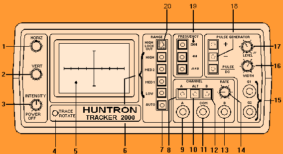 Another logic circuit analysis technique is useful with the logic probe. This technique is to run the circuit under test at its normal clock (timing) rate while monitoring for various control signals, such as RESET, START, STOP, SHIFT, TRANSFER, or CLOCK. Questions such as "Is the counter operating?" are quickly resolved by noting if the probe indicator is flashing on and off, indicating that pulse train activity is present. This ends our discussion on logic probes. Now, we'll study another piece of electronics test equipment that is used in evaluating integrated circuits, the HUNTRON TRACKER 2000. HUNTRON TRACKER 2000 The logic probe we just discussed is but one specialized tool used to isolate problems to the component level. Another device you can use is the Huntron Tracker 2000. It is a very versatile electronic troubleshooting tool that is used to evaluate suspect components and/or locate defective components on de-energized circuit cards quickly and safely without requiring the removal of component leads. The unit provides a built-in display that allows you to visually analyze the component under test conditions. Before connecting the Huntron Tracker 2000, you must first secure all power, then discharge all high-voltage capacitors. PHYSICAL FEATURES Because the Tracker 2000 has so many controls and indicators, it would impractical to cover each within this chapter. We will therefore concentrate our discussion only to the externally accessible features. To find information on internal controls and indicators, you should review the most current technical manual with up-to-date changes entered for the unit being used. Front Panel The front-panel (figure 5-18) design allows you to easily select the desired function. All the push buttons are the momentary action type and have light-emitting diode (LED) indicators embedded in them to show the functions that are active, by lighting up when active. A detailed description of each item on the front panel is provided in table 5-3 . Figure 5-18. - Front Panel.