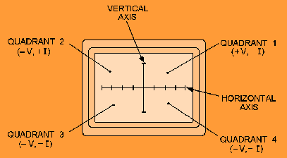 Cathode-Ray Tube (CRT) Display The CRT display (figure 5-19) is used to view the signature of the component under test. The display has a graticule consisting of a horizontal and vertical axes. The horizontal axis is used to represent voltage with the vertical axis being used to represent current. The axes divide the display into four quadrants. Each quadrant displays a different portion of the signature for the component under test. Figure 5-19. - CRT display.