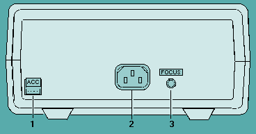 Back Panel The back panel (figure 5-20) provides three additional controls and connectors. One is the accessory output connector (ACC), which provides a clock signal and power for the Huntron Switcher Model HSR410. Next, is the power cord connector used to provide the required ac line voltage used to power the unit. The last item found on the back panel is the FOCUS control; this controls the focus for the front-panel CRT display. Figure 5-20. - Back panel.