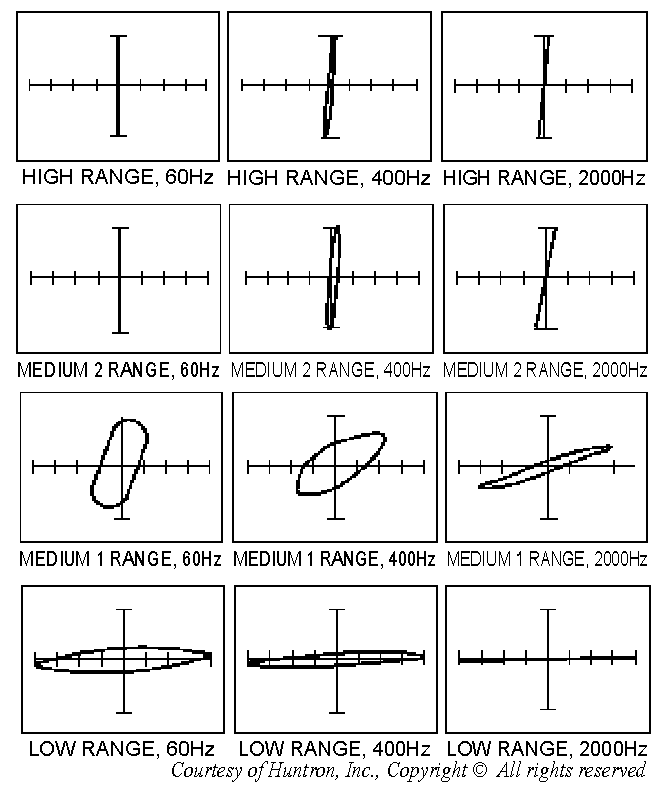 Testing Inductors Inductors, like capacitors, produce an elliptical signature on the Tracker 2000. Figure 5-35 shows you the signatures produced in each of the 12 range and frequency combinations by a 250mH inductor. Figure 5-35. - Signatures of a 250mH inductor.