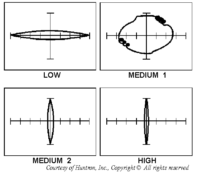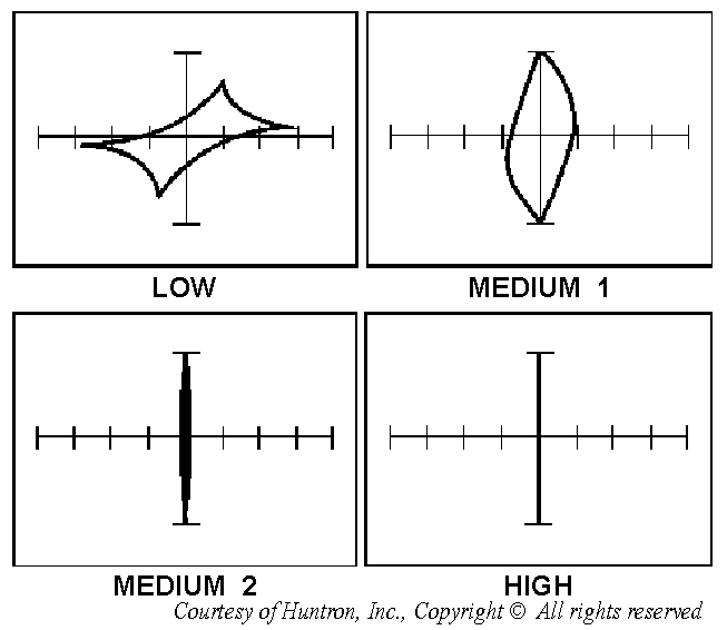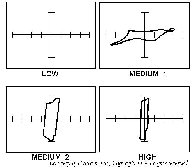 Ferrite inductors can also be checked using this unit; however, the signature produced will be different. Ferrite inductors operate well at high frequencies, but saturate at low frequencies. Figure 5-36 shows the signature of a 490mH ferrite inductor tested at 60 Hz. In low and medium 1, you can see that the signature shows distortion. However, in medium 2 and high ranges, the impedance of the inductor is low compared with the internal impedance of the Tracker 2000, so the signatures are a split vertical trace. Figures 5-37 and 5-38 show the same 490mH inductor being tested at 400 Hz and 2000 Hz. Figure 5-36. - Signatures of a 490mH ferrite inductor tested at 60 Hz.