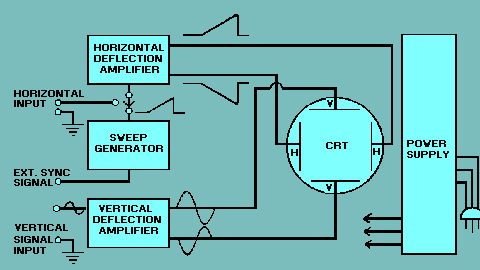 In the above example, 125 volts applied between one set of plates would deflect the beam 1 inch on the screen. This means that the deflection caused by small signals would likely not be observed. For this reason, the deflection plates are connected to amplifiers that magnify the signals applied to the vertical input of the scope. Assume, for example, that a peak-to-peak value of a known voltage applied to the oscilloscope indicates that each inch marking on the graticule is equal to 60 volts. Each of the 10 subdivisions will, therefore, equal a value of 6 volts. Most oscilloscopes have ATTENUATOR controls to decrease or GAIN controls to increase the strength of a signal before it is placed on the deflection plates. Attenuator and gain settings must not be disturbed after the calibration has been made. For maximum accuracy, you should recalibrate the graticule each time a voltage is to be measured. CRT DESIGNATIONS Cathode-ray tubes are identified by a tube number, such as 2AP1, 2BP4, or 5AP1A. The first number identifies the diameter of the tube face. Typical diameters are 2 inches, 5 inches, and 7 inches. The first letter designates the order in which a tube of a given diameter was registered. The letter-digit combination indicates the type of phosphor (glowing material) used on the inside of the screen. Phosphor P1, which is used in most oscilloscopes, produces a green light at medium PERSISTENCE. Persistence refers to the length of time the phosphor glows after the electron beam is removed. P4 provides a white light and has a short persistence. If a letter appears at the end, it signifies the number of the modification after the original design. OSCILLOSCOPE CONTROL COMPONENTS Although the CRT is a highly versatile device, it cannot operate without control circuits. The type of control circuits required depends on the purpose of the equipment in which the CRT is used. There are many different types of oscilloscopes. They vary from relatively simple test instruments to highly accurate laboratory models. Although oscilloscopes have different types of circuits, most can be divided into the basic sections shown in figure 6-13: (1) a CRT, (2) a group of control circuits that control the waveform fed to the CRT, (3) a power supply, (4) sweep circuitry, and (5) deflection circuitry. Figure 6-13. - Block diagram of an oscilloscope.