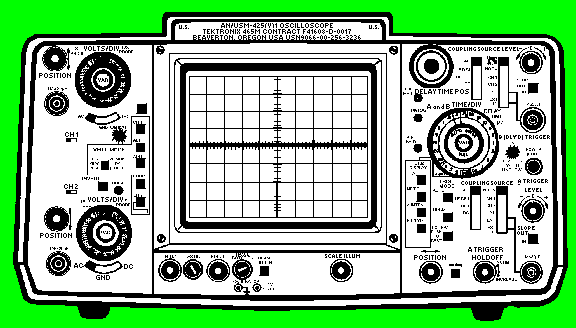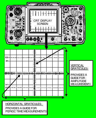 The oscilloscope in figure 6-14 is called DUAL-TRACE because it can accept and display two vertical signal inputs at the same time - usually for comparison of the two signals or one signal and a reference signal. This scope can also accept just one input. In this case, it is used as a SINGLE-TRACE OSCILLOSCOPE. For the following discussion, we will consider this to be a single-trace oscilloscope. The oscilloscope in the figure is commonly used in the fleet. You are likely to use this one (model AN/USM-425) or one very similar to it. Let's now look at the front panel controls. COMPONENTS USED TO DISPLAY THE WAVEFORM The CRT DISPLAY SCREEN is used to display the signal (figure 6-15 ). It allows you to make accurate measurements using the vertical and horizontal graticules, as discussed earlier. Figure 6-15. - CRT display and graticule.
