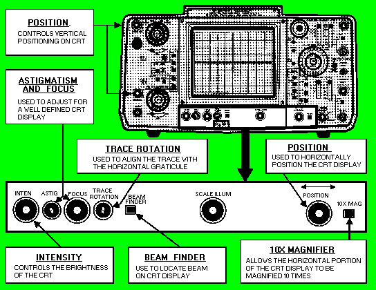 COMPONENTS USED TO ADJUST CRT DISPLAY QUALITY The controls in figure 6-16 allow you to adjust for a clear signal display. They also allow you to adjust the display position and magnify the horizontal trace by a factor of 10 (X10). Keep in mind that the controls may be labeled differently from one model to another, depending on the manufacturer. Refer to figure 6-16 as you study the control descriptions in the next paragraphs. Figure 6-16. - Quality adjustment for CRT display.