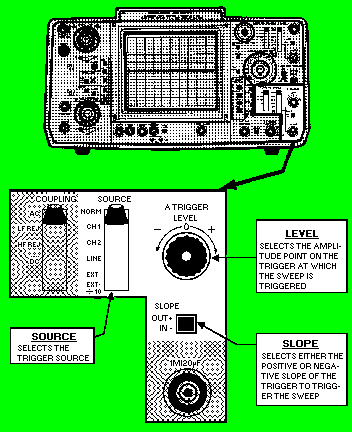 COMPONENTS USED TO PROVIDE A STABLE DISPLAY The triggering and level controls are used to synchronize the sweep generator with the input signal. This provides a stationary waveform display. If the input signal and horizontal sweep generator are unsynchronized, the pattern tends to jitter, making observations difficult. The A TRIGGER controls at the lower right of the scope (figure 6-26) are used to control the stability of the oscilloscope CRT display. They are provided to permit you to select the source, polarity, and amplitude of the trigger signal. These controls, labeled A TRIGGER, LEVEL, SOURCE, and SLOPE, are described in the following paragraphs. Figure 6-26. - Components that control stability.