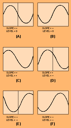 SOURCE Control The SOURCE control allows you to select the appropriate source of triggering. You can select input signals from channel 1 or 2, the line (60 hertz), or an external input. TRIGGER LEVEL/SLOPE Controls The LEVEL control allows you to select the amplitude point of the trigger signal at which the sweep is triggered. The SLOPE lets you select the negative or positive slope of the trigger signal at which the sweep is triggered. The TRIGGER LEVEL (mounted with the TRIGGER SLOPE on some scopes) determines the voltage level required to trigger the sweep. For example, in the TRIGGER modes, the trigger is obtained from the signal to be displayed. The setting of the LEVEL control determines the amplitude point of the input waveform that will be displayed at the start of the sweep. Figure 6-27 shows some of the displays for a channel that can be obtained for different TRIGGER LEVEL and TRIGGER SLOPE settings. The level is zero and the slope is positive in view A; view B also shows a zero level but a negative slope selection. View C shows the effects of a positive trigger level setting and positive trigger slope setting; view D displays a negative trigger level setting with a positive trigger slope setting. Views E and F have negative slope settings. The difference is that view E has a positive trigger level setting, whereas F has a negative trigger level setting. Figure 6-27. - Effects of SLOPE and TRIGGER LEVEL controls.