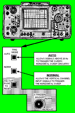 In most scopes, an automatic function of the trigger circuitry allows a free-running trace without a trigger signal. However, when a trigger signal is applied, the circuit reverts to the triggered mode of operation and the sweep is no longer free running. This action provides a trace when no signal is applied. Synchronization is also used to cause a free-running condition without a trigger signal. Synchronization is not the same as triggering. TRIGGERING refers to a specific action or event that initiates an operation. Without this event, the operation would not occur. In the case of the triggered sweep, the sweep will not be started until a trigger is applied. Each succeeding sweep must have a trigger before a sweep commences. SYNCHRONIZATION, however, means that an operation or event is brought into step with a second operation. A sweep circuit that uses synchronization instead of triggering will cause a previously free-running sweep to be locked in step with the synchronizing signal. The TRIGGER LEVEL control setting can be increased until synchronization occurs; but, until that time, an unstable pattern will appear on the CRT face. COUPLING Section The COUPLING section allows you to select from four positions: AC, LF REJ, HF REJ, and DC. The AC position incorporates a coupling capacitor to block any dc component. The LF and HF REJ positions reject low- and high-frequency components, respectively. The DC position provides direct coupling to the trigger circuits. This is useful when you wish to view only the LF or HF component of a signal. COMPONENTS USED TO SELECT SCOPE TRIGGERING The TRIG MODE section in figure 6-28 allows for automatic triggering or normal triggering. In AUTO (automatic), the triggering will be free-running in the absence of a proper trigger input or will trigger on the input signal at frequencies above 20 hertz. In NORM (normal), the vertical channel input will trigger the sweep. Figure 6-28. - Components to select triggering.