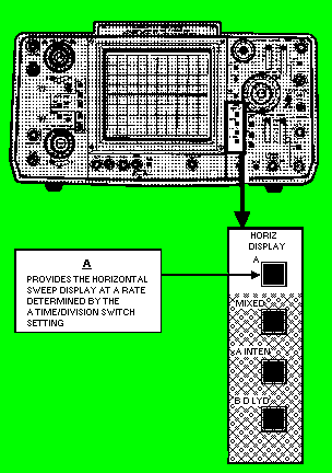 COMPONENTS USED TO SELECT HORIZONTAL-DEFLECTION MODE For the present, notice only that the HORIZ DISPLAY (horizontal display) in figure 6-29 can be controlled by the TIME/DIV switch. Other switches in this section will be explained later in this chapter. Figure 6-29. - Components to select mode of horizontal deflection.