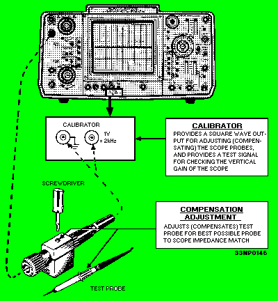 COMPONENTS USED TO CALIBRATE THE PROBE OF THE SCOPE In figure 6-30, you can see the components used to calibrate the test probe on the scope. A 1-volt, 2-kilohertz square wave signal is provided for you to adjust the probe for an accurate square wave and to check the vertical gain of the scope. You adjust the probe with a screwdriver, as shown in the figure. Figure 6-30. - Components to calibrate probe.