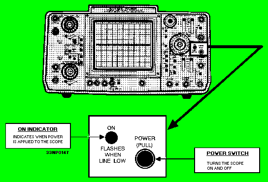 TURNING ON THE SCOPE Before turning on the scope, make sure it is plugged into the proper power source. This may seem obvious, but many technicians have turned all knobs on the front panel out of adjustment before they noticed that the power cord was not plugged in. On some scopes, the POWER switch is part of the INTEN (intensity) control. Turn or pull the knob until you hear a click or a panel light comes on (figure 6-31). Let the scope warm up for a few minutes so that voltages in all of the circuits become stabilized. Figure 6-31. - Components to energize scope.
