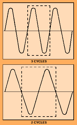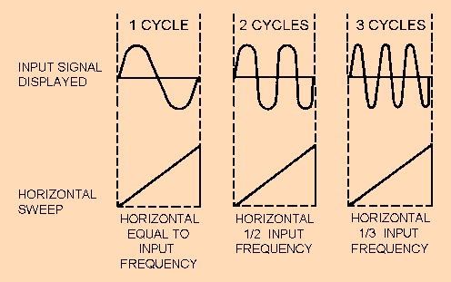 The center cycle of three cycles provides you with an undistorted waveform in its correct phase. The center of a two-cycle presentation will appear inverted, but will be undistorted. To place waveforms on the CRT in this manner, you must understand the relationship between horizontal and vertical frequencies. The relationship between the frequencies of the waveform on the vertical plates and the sawtooth on the horizontal plates determines the number of cycles on the screen, as shown in figure 6-33. Figure 6-33. - Vertical versus horizontal relationship.