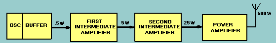 INTRODUCTION In the previous chapter you learned the fundamentals of U.S. naval telecommunications and communications. Now, let's look at the equipment and systems that are used to communicate in the Navy. The fundamental equipment used to communicate are the transmitter and receiver. Transmitters and receivers must each perform two basic functions. The transmitter must generate a radio frequency signal of sufficient power at the desired frequency. It must have some means of varying (or modulating) the basic frequency so that it can carry an intelligible signal. The receiver must select the desired frequency you want to receive and reject all unwanted frequencies. In addition, receivers must be able to amplify the weak incoming signal to overcome the losses the signal suffers in its journey through space. Representative transmitters and their fundamental features are described for you in this module. Basic communication transmitters include continuous wave (cw), amplitude modulated (AM), frequency modulated (fm), and single sideband (ssb) types. A basic description of each of these transmitters is given in this chapter. CONTINUOUS WAVE TRANSMITTER The continuous wave is used principally for radiotelegraphy; that is, for the transmission of short or long pulses of rf energy to form the dots and dashes of the Morse code characters. This type of transmission is sometimes referred to as interrupted continuous wave. Cw transmission was the first type of radio communication used, and it is still used extensively for long-range communications. Two of the advantages of cw transmission are a narrow bandwidth, which requires less output power, and a degree of intelligibility that is high even under severe noise conditions. (For example, when the receiver is in the vicinity of rotating machinery or thunderstorms.) A cw transmitter requires four essential components. These are a generator, amplifier, keyer, and antenna. We have to generate rf oscillations and have a means of amplifying these oscillations. We also need a method of turning the rf output on and off (keying) in accordance with the intelligence to be transmitted and an antenna to radiate the keyed output of the transmitter. Let's take a look at the block diagram of a cw transmitter and its power supply in figure 2-1. The oscillator generates the rf carrier at a preset frequency and maintains it within close tolerances. The oscillator may be a self-excited type, such as an electron-coupled oscillator, or a quartz crystal type, which uses a crystal cut to vibrate at a certain frequency when electrically excited. In both types, voltage and current delivered by the oscillator are weak. The oscillator outputs must be amplified many times to be radiated any distance. Figure 2-1. - Cw transmitter block diagram. The buffer stage or first intermediate power amplifier stage (referred to as the ipa) is a voltage amplifier that increases the amplitude of the oscillator signal to a level that drives the power amplifier (pa). You will find the signal delivered by the buffer varies with the type of transmitter and may be hundreds or thousands of volts. The buffer serves two other purposes. One is to isolate the oscillator from the amplifier stages. Without a buffer, changes in the amplifier caused by keying or variations in source voltage would vary the load of the oscillator and cause it to change frequency. It may also be used as a frequency multiplier, which is explained later in this text. As you can see in the figure, a key is used to turn the buffer on and off. When the key is closed, the rf carrier passes through the buffer stage; when the key is open (buffer is turned off), the rf carrier is prevented from getting through. The final stage of a transmitter is the power amplifier (referred to as the pa). In chapter 3 of NEETS, Module 1, Introduction to Matter, Energy, and Direct Current, you learned that power is the product of current and voltage (P = IE). In the power amplifier a large amount of rf current and voltage is made available for radiation by the antenna. The power amplifier of a high-power transmitter may require far more driving power than can be supplied by an oscillator and its buffer stage. One or more low-power intermediate amplifiers are used between the buffer and the final amplifier that feeds the antenna. The main difference between many low- and high-power transmitters is in the number of intermediate power-amplifier stages used. Figure 2-2 is a block diagram of the input and output powers for each stage of a typical medium-power transmitter. You should be able to see that the power output of a transmitter can be increased by adding amplifier stages capable of delivering the power required. In our example, the .5 watt output of the buffer is amplified in the first intermediate amplifier by a factor of 10, (this is a times 10 [ X 10] amplifier) giving us an input of 5 watts to the second intermediate amplifier. You can see in this example the second intermediate amplifier multiplies the 5 watt input to it by a factor of 5 ( X 5) and gives us a 25 watt input to our power (final) amplifier. The final amplifier multiplies its input by a factor of 20 (X 20) and gives us 500 watts of power out to the antenna. Figure 2-2. - Intermediate amplifiers increase transmitter power.