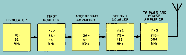 Designing and building a stable crystal oscillator is difficult. As operating frequencies increase, the crystal must be ground so thin that it often cracks while vibrating. You will find that you can get around this problem by operating the oscillators in most transmitters at comparatively low frequencies, sometimes as low as 1/100 (.01) of the output frequency. You raise the oscillator frequency to the required output frequency by passing it through one or more frequency multipliers. Frequency multipliers are special power amplifiers that multiply the input frequency. Stages that multiply the frequency by 2 are called doublers; those that multiply by 3 are triplers; and those multiplying by 4 are quadruplers. You will find the main difference between low-frequency and high-frequency transmitters is the number of frequency-multiplying stages used. Figure 2-5 shows the block diagram of the frequency-multiplying stages of a typical Navy uhf/vhf transmitter. The oscillator in this transmitter is tunable from 18 megahertz to 32 megahertz. You have multiplier stages that increase the oscillator frequency by a factor of 12 through successive multiplications of 2, 2, and 3. Figure 2-5. - Frequency multiplying stages of a typical vhf/uhf transmitter.