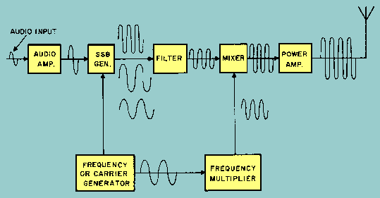 SINGLE-SIDEBAND TRANSMITTER You should remember the properties of modulation envelopes from your study of NEETS, Module 12, Modulation Principles. A carrier that has been modulated by voice or music is accompanied by two identical sidebands, each carrying the same intelligence. In amplitude-modulated (AM) transmitters, the carrier and both sidebands are transmitted. In a single-sideband transmitter (ssb), only one of the sidebands, the upper or the lower, is transmitted while the remaining sideband and the carrier are suppressed. SUPPRESSION is the elimination of the undesired portions of the signal. Figure 2-7 is the block diagram of a single-sideband transmitter. You can see the audio amplifier increases the amplitude of the incoming signal to a level adequate to operate the ssb generator. Usually the audio amplifier is just a voltage amplifier. Figure 2-7. - Ssb transmitter block diagram.