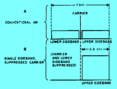 The ssb generator (modulator) combines its audio input and its carrier input to produce the two sidebands. The two sidebands are then fed to a filter that selects the desired sideband and suppresses the other one. By eliminating the carrier and one of the sidebands, intelligence is transmitted at a savings in power and frequency bandwidth. In most cases ssb generators operate at very low frequencies when compared with the normally transmitted frequencies. For that reason, we must convert (or translate) the filter output to the desired frequency. This is the purpose of the mixer stage. A second output is obtained from the frequency generator and fed to a frequency multiplier to obtain a higher carrier frequency for the mixer stage. The output from the mixer is fed to a linear power amplifier to build up the level of the signal for transmission. Suppressed Carrier In ssb the carrier is suppressed (or eliminated) at the transmitter, and the sideband frequencies produced by the carrier are reduced to a minimum. You will probably find this reduction (or elimination) is the most difficult aspect in the understanding of ssb. In a single-sideband suppressed carrier, no carrier is present in the transmitted signal. It is eliminated after modulation is accomplished and is reinserted at the receiver during the demodulation process. All rf energy appearing at the transmitter output is concentrated in the sideband energy as "talk power." After the carrier is eliminated, the upper and lower sidebands remain. If one of the two sidebands is filtered out before it reaches the power amplifier stage of the transmitter, the same intelligence can be transmitted on the remaining sideband. All power is then transmitted in one sideband, instead of being divided between the carrier and both sidebands, as it is in conventional AM. This provision gives you an increase in power for the wanted sideband. You should note in figure 2-8 that the bandwidth required for the ssb suppressed carrier, view B, is approximately half that needed for conventional AM, view A. This enables us to place more signals in a smaller portion of the frequency spectrum and permits a narrower receiver bandpass. Figure 2-8. - Comparison of bandwidths of conventional AM and ssb voice channels.