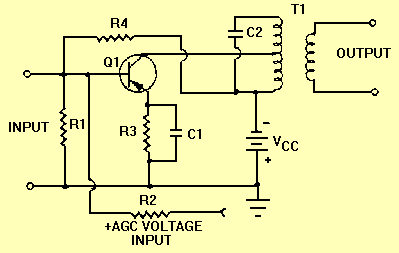 You should remember that, depending on transistor types, the receiver may require either a positive or a negative agc voltage. A negative agc voltage could be easily obtained by reversing CR1. Once the values for R2 and C2 have been selected, the voltage divider action of the components is fixed, and the circuit operates automatically without further adjustment. If the average amplitude of the signal increases, the charge on C2 will also increase. If the signal amplitude decreases so does the charge on C2. The agc voltages in a receiver provide controlled degenerative feedback. By adjusting the operating point of an amplifier, you can control the gain. Under no-signal conditions, bias of the rf and IF amplifiers is developed by standard means, such as self bias. With an applied signal, an agc voltage is developed, which in conjunction with normal biasing methods develops the operating bias for the amplifiers. TRANSISTOR AMPLIFIER GAIN. - You have seen how a dc voltage that is obtained at the output of the agc network is proportional to, and will reflect, the average variations of the average signal level. Now all we have to do is use this agc voltage to control the amplification of one or more of the preceding amplifiers. Figure 2-17 illustrates a common-emitter amplifier with agc applied to the base element. A change in the agc voltage will change the operating point of the transistor and the dc emitter current. In this circuit, R1 and R4 form a voltage divider and establish no-signal (forward) bias on the base. Since a pnp transistor is used, the base has a negative potential. The agc voltage from the detector is positive with respect to ground and is fed to the base through dropping resistor R2. You will find when the dc output of the detector increases (because of an increase in the average signal level) the agc voltage will become more positive. This increased positive potential is applied to the base of Q1, which decreases the forward bias of Q1 and decreases the gain of the amplifier. Agc, in this application, works with controlled degenerative feedback. Use of an npn transistor, in the same configuration, would require the agc voltage to possess a negative potential. Figure 2-17. - Common emitter amplifier with agc.