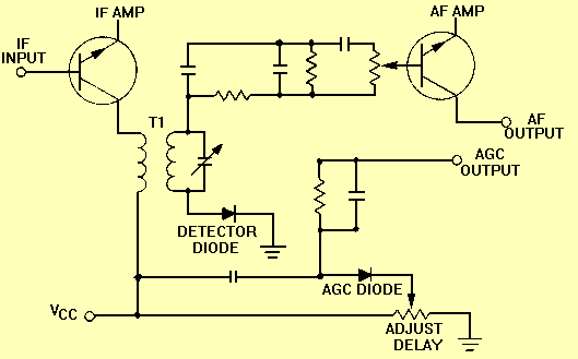 circuitry in figure 2-19. This type of system develops no agc feedback until an established received signal strength is attained. For signals weaker than this value, no agc is developed. For sufficiently strong signals, the delayed agc circuit operates essentially the same as ordinary agc.">