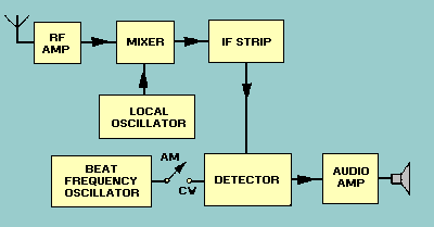 Our circuit uses two separate diodes; one is the detector diode and the other the agc diode. The agc diode is connected to the primary of the last IF transformer and the detector diode to its secondary. A positive bias is applied to the cathode of the agc diode. This keeps it from conducting until a prearranged signal level has been reached. The adjust delay control allows manual control of the agc diode bias. Manual control allows you to select the signal level at which agc is applied. If mostly weak stations are to be received, the setting should be high (no agc until the signal level is high). However, you should set it as low as possible to prevent overloading of the last IF amplifier by stronger signals. Finally, you must have two diodes to obtain delayed agc. If only one diode were used, the agc would be developed from the detector diode, and there would be no delayed action. Or, if a signal diode were biased to provide the delaying action desired, no signal would pass to the audio amplifier until the bias was exceeded by the input signal. Beat-Frequency Oscillator The beat-frequency oscillator (bfo) is necessary when you want to receive cw signals. Cw signals are not modulated with an audio component, you remember, so we must provide one. The action of the rf amplifier, mixer, local oscillator, and IF amplifier is the same for both cw and AM; but the cw signal reaches the detector as a single frequency signal with no sideband components. To produce an af output, you must heterodyne (beat) any cw signal with an rf signal of the proper frequency. This separate signal is obtained from an oscillator known as a beat-frequency oscillator. Figure 2-20 is a block diagram of a superheterodyne receiver capable of receiving and demodulating a cw signal. The bfo heterodynes at the detector and produces an af output. The detector (second detector) is used primarily because the mixer (first detector) is normally used as the source of agc. Figure 2 - 20. - Placement of the beat frequency oscillator.