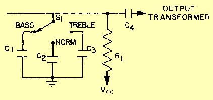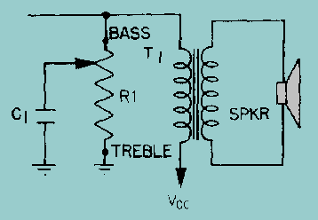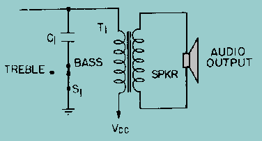 Audio Tone The tone of the sound reproduced in the audio section of a receiver depends on several factors. The Frequency response of the audio amplifiers determines the degree of amplification provided to different frequencies in the sound spectrum. The size and quality of any loudspeaker used will determine its response to various frequencies. Response of the human ear is the final judge of tonal quality, and that varies with the individual. Because of these variables, some form of tone control is sometimes used in Navy receivers. Treble tones are defined as the audio frequencies above approximately 3,000 hertz and bass tones are those below approximately 300 hertz. Although several methods of tone control can be used, we are only going to mention the attenuation method. With this method, a decrease in the intensity of one tone can produce an apparent increase in the intensity of another tone. As an example, let's look at tones of 400 and 4,000 hertz produced by a speaker with the same intensity. If we reduce the intensity of the 4,000-hertz tone, the 400-hertz tone will appear to be louder, even though its intensity has not actually changed. You should see from this example that bass emphasis can be accomplished by attenuating treble tones. The simplest type of tone control is illustrated in figure 2-22. Fixed capacitor C1 parallels the primary winding of the output transformer, effectively shunting the higher frequencies to ground. The size of C1 determines the lowest frequency to be affected. When you select the BASS position of the tone control, C1 is connected and improves bass response by de-emphasizing the treble tones. You can often use this circuit to improve the output of a small speaker with poor treble response. Figure 2-22. - Fixed capacitor tone control.