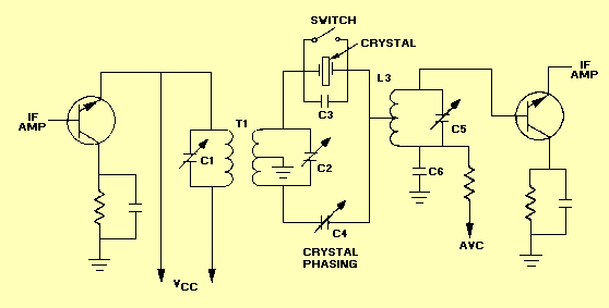 Crystal Filters A quartz crystal, used as a selective filter in the IF section of a communications receiver, is one of the most effective methods of achieving maximum selectivity. It is especially useful when the channel is crowded and considerable noise (both external and internal) is present. One possible circuit arrangement is shown in figure 2-25. Let's look at the theory involved in understanding this circuit. You can see a crystal in one leg of the bridge circuit. The secondary of the input transformer (T1) is balanced to ground through the center tap connection. The crystal acts as a high Q series resonant circuit. It allows signals within the immediate vicinity of resonance to pass through the crystal to the output coil (L3). The desired signal appears between the center tap of L3 and ground. Figure 2-25. - Crystal filter used in the IF section of a superheterodyne receiver.