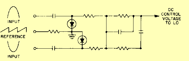 The frequency discriminator controls the varicap in this receiver. A varicap is used to keep the IF stable. You may want to review varicap theory in chapter 3 of NEETS, Module 7, Introduction to Solid-State Devices and Power Supplies at this point. The varicap application here produces an apparent reactance, which is included in the oscillator frequency control circuitry. For example, let's assume the IF is 455 kilohertz and the local oscillator (lo) is tracking below the incoming station. When the lo output decreases slightly in frequency, the IF will rise. This causes the output of the discriminator to increase the capacitive reactance of the varicap, which increases the oscillator frequency to the desired value. Now let's assume the lo output increases. The IF will then decrease. This causes the discriminator output to decrease the capacitive reactance of the varicap. This will cause the oscillator frequency to decrease. Figure 2-27 shows another widely used type of afc and its circuitry. This type is commonly referred to as a BALANCED-PHASE DETECTOR or PHASE-DISCRIMINATOR. This circuit uses fixed capacitors and the varying conductance of the diodes to achieve a variable reactance. As you have seen in the block diagram, an afc circuit requires two sections, a frequency detector and a variable reactance. Our detector output is a dc control voltage proportional to the amount of frequency change. This dc voltage is applied directly to the oscillator. The phase inverter input signals are discriminated IF outputs fed to the two diodes 180 degrees out of phase. Figure 2-27. - Automatic frequency control (phase discriminator).