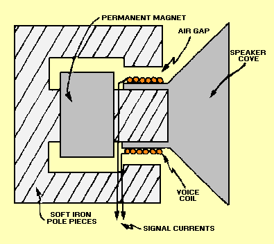 The purpose of audio reproduction devices, such as loudspeakers and headphones, is to convert electrical audio signals to sound power. Figure 2-30 shows you a diagram of a loudspeaker called the PERMANENT MAGNET SPEAKER. This speaker consists of a permanent magnet mounted on soft iron pole pieces, a voice coil that acts as an electromagnet, and a loudspeaker cone connected to the voice coil. The audio signal has been previously amplified (in terms of both voltage and power) and is applied to the voice coil. The voice coil is mounted on the center portion of the soft iron pole pieces in an air gap so that it is mechanically free to move. It is also connected to the loudspeaker cone; as it moves, the cone will also move. When audio currents flow through the voice coil, the coil moves back and forth proportionally to the applied ac current. As the cone (diaphragm) is attached to the voice coil, it also moves in accordance with the signal currents; in so doing, it periodically compresses and rarefies the air, which produces sound waves. Figure 2-30. - Permanent magnet speaker.