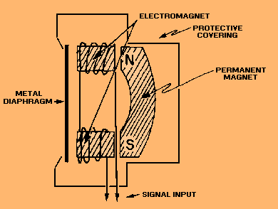 Figure 2-32 shows a diagram of typical headphones used with Navy equipment. The device consists of a permanent magnet and two small electromagnets through which the signal currents pass. A soft iron diaphragm is used to convert the electrical effects of the device into sound power. When no signal currents are present, the permanent magnet exerts a steady pull on the soft iron diaphragm. Signal current flowing through the coils mounted on the soft iron pole pieces develops a magnetomotive force that either adds to or subtracts from the field of the permanent magnet. The diaphragm thus moves in or out according to the resultant field. Sound waves are then reproduced that have an amplitude and frequency (within the mechanical capability of the reproducer) similar to the amplitude and frequency of the signal currents. Figure 2-32. - Headphone.