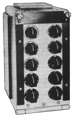 Under standard operating conditions up to four of these units can be used in parallel with a single transmitter and receiver group to provide additional operating positions. This setup is often found aboard ship where a transmitter and/or receiver is controlled and operated from several locations such as the bridge or the combat information center. TRANSFER SWITCHBOARDS A transmitter transfer switchboard provides the capability to transfer remote control station functions and signals to transmitters. Figure 3-3 is a representative transfer switchboard that provides the capability for selectively transferring any one, or all, of ten remote control station functions and signals to any one of six transmitters. The cabinet has ten rotary switches arranged in two vertical rows of five each. Each switch has eight positions. The circuitry is arranged so that you cannot parallel transmitter control circuits; that is, you cannot connect more than one transmitter to any remote control location. Figure 3-3. - Transmitter transfer switchboard.