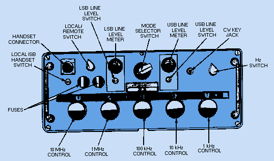 RADIO TRANSMITTER. - Figure 3-8 shows the front panel of the radio transmitter unit. The radio transmitter accepts audio or coded intelligence and uses it to modulate one of 280,000 possible operating radio frequencies in the 2.0- to 29.999-megahertz frequency range. Tuning is accomplished digitally by means of five control knobs and a switch located on the front panel. The transmitter has a normal rf output level of at least 100 milliwatts and is designed to be used with an associated rf power amplifier. Figure 3-8. - Radio transmitter unit.