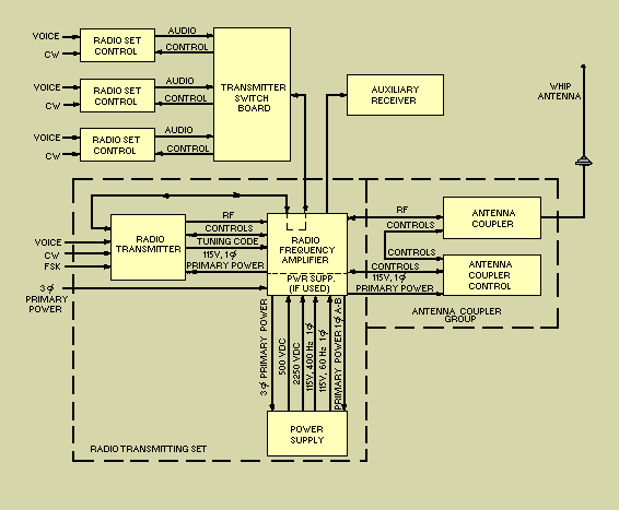 When the AM and ssb transmit modes of operation are used, the output from a handset is applied to the transmitter. The voice signals are amplified and used to modulate a 500-kilohertz local carrier that produces a 500-kilohertz IF. The resulting double sideband signal is filtered in the AM mode, amplified, and converted by a triple-conversion process to the desired rf operating frequency. The rf signal is amplified to a nominal 100 milliwatt level. In cw operation, the 500-kilohertz local carrier is inserted directly into the IF amplifiers. The signal is further processed in the same manner as the voice signals in the AM or ssb modes of operation. In fsk operation, the loop current is converted to audio frequencies representing marks and spaces. These audio signals are applied to the audio circuits of the transmitter. Thereafter, these signals are processed in the same manner as the voice signals in AM or ssb modes of operation. A typical radio transmitting set block diagram is shown in figure 3-9. Figure 3-9. - Typical radio transmitting set block diagram.