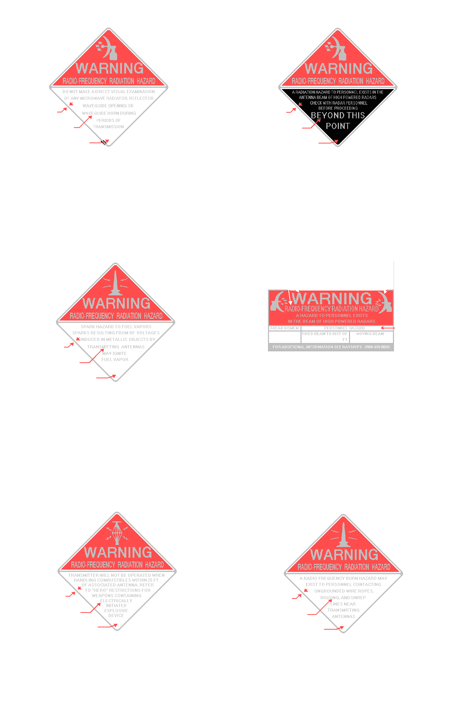 These hazardous situations can be caused by a transmitter or antenna installation. These generate electromagnetic radiation in the vicinity of personnel, ordnance, or fueling operations in excess of established safe levels. Sometimes the existing electromagnetic radiation levels increase to a hazardous level. When personnel, ordnance, or fueling evolutions are located in an area that can be illuminated by electromagnetic radiation, hazardous situations may occur. Electromagnetic radiation is hazardous to personnel in two ways. It can cause rf burns; and it can cause biological, thermal, and neurological effects to personnel (RADHAZ). Because of the differences in characteristics and safety precautions required for each of the two types, they will be discussed separately. An rf burn hazard is a hazardous condition caused by the existence of radio frequency (rf) voltages in places where they are not intended to be. Any ship with high-power hf transmitters is susceptible. Potentially hazardous voltages have been found in many areas. Some of these areas are lifelines, vertical ladders, ASROC launchers, gun mounts, rigging for underway replenishment, and boat davits. Another of these areas is on aircraft tied down on carrier and helicopter flight decks. Whether or not an induced voltage creates an rf burn hazard depends on whether personnel will come into contact with the object being energized. Generally, only the voltage between an object and the deck is important. The rf burn occurs when a person comes into contact with a source of rf voltage in a manner that allows rf current to flow through the area of contact. Resistance of the skin to the current flow at the areas of contact causes heat. The effect of the heat on a person at the point of contact ranges from noticeable warmth to a painful burn. The most useful and widespread technique in the reduction of rf burn hazards is the proper bonding and grounding of all metallic objects in the rf radiation field. In some cases, the rf burn hazard can be eliminated only through the use of restrictive operating procedures. These procedures govern the simultaneous use of transmitting and cargo equipment. Techniques such as operation of transmitters at reduced power and the prohibition of simultaneous use of certain combinations of antennas, frequencies, and cargo handling equipment are used. Figure 3-35 shows typical rf radiation hazard warning signs. Figure 3-35. - Typical rf radiation hazard warning signs.
