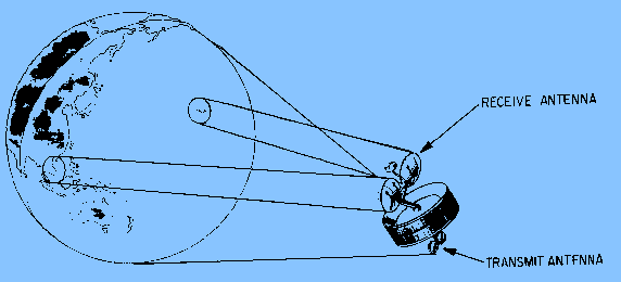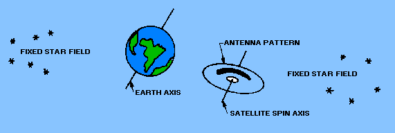 Satellite Power Sources Early communications satellites were severely limited by the lack of suitable power sources. This severely limited the output power of the satellite transmitter. The only source of power available within early weight restrictions was a very inefficient panel of solar cells without battery backup. A major disadvantage of this type of power source is that the satellite has no power when it is in ECLIPSE (not in view of the sun). For continuous communications, this outage is unacceptable. A combination of solar cells and storage batteries is a better prime power source. This is a practical choice, even though the result is far from an ideal power source. About ten percent of the energy of the sunlight that strikes the solar cells is converted to electrical power. This low rate is sometimes decreased even further. You find this when the solar cells are bombarded by high-energy particles that are sometimes found in space. Early satellites had over 8,500 solar cells mounted on the surface of the satellite, which supplied about 42 watts of power. No battery backup was provided in these satellites. Newer communications satellites have about 32,000 solar cells mounted on the surface of the satellite, and they supply about 520 watts. A nickel cadmium battery is used for backup power during eclipses. Nuclear power sources have been used in space for special purposes, but their use stops there. Technology has not progressed sufficiently for nuclear power sources to be used as a power source. Satellite Orientation Satellite orientation in space is important for continuous solar cell and antenna orientation. Since the primary source of power in most satellites is from solar cells, a maximum number of the solar cells must be exposed to the sun at all times. The satellite antenna must also be pointed at the appropriate earth terminals. Our communications satellites use what is termed spin stabilization to meet these important requirements. Spin stabilization operates on the principle that direction of the spin axis of a rotating body tends to remain fixed in space. An example of spin stabilization is the effect of the rotation of the earth in keeping its axis fixed in space. A satellite that has a spin axis parallel to the axis of the earth will maintain this position since both axes are fixed in space. Figure 4-8 illustrates the use of this principle. It depicts an equatorial orbit satellite used to keep a doughnut-shaped antenna pattern pointing toward the earth. Figure 4-8. - Spin-stabilized satellite antenna pattern.