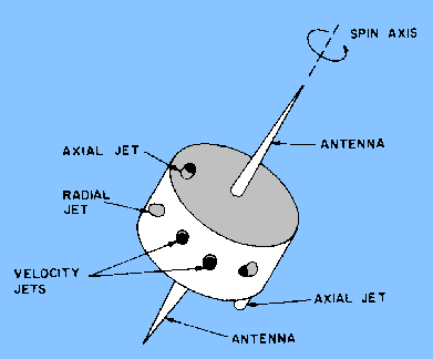 Once the system is in motion, spin stabilization requires virtually no additional energy. A spin-stabilized satellite is usually constructed like a flywheel. Its heavier equipment is mounted in the same plane and as close to the outside surface as possible. After reaching its orbit, the radial jets are pulsed to start the satellite spinning. The satellite spin axis is orientated to the axis of the earth by means of small axial jets. Velocity jets are used to place the satellite in orbit position and provide velocity correction. Figure 4-9 is an example of spin stabilization. Figure 4-9. - Spin-stabilized satellite controls.