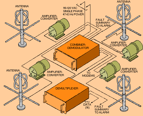 SHIPBOARD RECEIVE-ONLY EQUIPMENT SYSTEMS The purpose of a shipboard receive-only system is to receive fleet multichannel teletypewriter broadcasts, which, as you recall from chapter 1, require no receipt. These are transmitted from a ground station and relayed to naval vessels by satellite. Figure 4-13 is a typical shipboard receive-only system. In this system the transmitted carrier may be frequency modulated (fm) or phase-shift-key (psk) modulated for tty operation. The receiving antennas for this system are positioned about the ship. They are arranged in a manner (normally one in each quadrant of the ship) that at no time allows the line-of-sight to be blocked between the relay satellite and one or more of the antennas. Incoming signals pass from the antennas to an amplifier-converter. Each amplifier-converter routes an IF signal on one line of a twin axial cable that connects it to the combiner-demodulator. An operating power and local-oscillator signal are coupled from the combiner-demodulator to each amplifier-converter on the other line of the cable used for the IF signal. Because of signal path variations, shading, and reflections, the incoming signals are subject to random phase and amplitude variations. The combiner operation performed within the combiner-demodulator removes the phase variations from each input signal. It then measures the amplitudes of the signals for optimum combining and sums the signals. After being combined, the signal is demodulated and coupled from a receiver transfer switchboard to a telegraph demultiplex terminal. Figure 4-13. - Typical shipboard receive only system.
