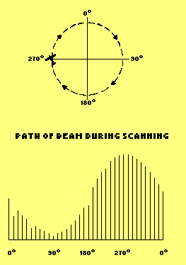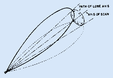 SCANNING Radar systems are often identified by the type of SCANNING the system uses. Scanning is the systematic movement of a radar beam in a definite pattern while searching for or tracking a target. The type and method of scanning used depends on the purpose and type of radar and on the antenna size and design. In some cases, the type of scan will change with the particular system mode of operation. For example, in a particular radar system, the search mode scan may be quite different from that of the track mode scan. Stationary-Lobe Scanning A SINGLE STATIONARY-LOBE SCANNING SYSTEM is the simplest type of scanning. This method produces a single beam that is stationary in relation to the antenna. The antenna is then mechanically rotated continuously to obtain complete 360-degree azimuth coverage. A stationary lobe, however, cannot satisfactorily track a moving object because it does not provide enough information about the object's movement to operate automatic tracking circuits, such as those in fire-control tracking radar. A two-dimensional search radar, however, does use a single-lobe that is scanned in a 360-degree pattern because automatic tracking circuits are not normally used in 2D radars. Single-lobe scanning is unsuitable for use as a tracking radar for several reasons. For example, let's assume that a target is somewhere on the lobe axis and the receiver is detecting signals reflected from the target. If these reflected signals begin to decrease in strength, the target likely has flown off the lobe axis. In this case, the beam must be moved to continue tracking. The beam might be moved by an operator tracking the target with an optical sight, but such tracking is slow, inaccurate, and limited by conditions of visibility. An automatic tracking system would require that the beam SCAN, or search, the target area in such a case. Again, assume that a missile is riding (following) the axis of a single beam. The strength of the signals it receives (by means of a radar receiver in the missile) will gradually decrease as its distance from the transmitter increases. If the signal strength decreases suddenly, the missile will know, from built-in detection circuitry, that it is no longer on the axis of the lobe. But it will not know which way to turn to get back on the axis. A simple beam does not contain enough information for missile guidance. Methods of Beam Scanning The two basic methods of beam scanning are MECHANICAL and ELECTRONIC. In mechanical scanning, the beam can be moved in various ways: (1) The entire antenna can be moved in the desired pattern; (2) the energy feed source can be moved relative to a fixed reflector; or (3) the reflector can be moved relative to a fixed source. In electronic scanning, the beam is effectively moved by such means as (1) switching between a set of feeder sources, (2) varying the phasing between elements in a multielement array, or (3) comparing the amplitude and phase differences between signals received by a multielement array. A combination of mechanical and electronic scanning is also used in some antenna systems. MECHANICAL SCANNING. - The most common type of mechanical scanning is the rotation of the antenna through 360 degrees to obtain azimuth coverage. Most search radar sets use this method. A common form of scanning for target tracking or missile beam-rider systems is CONICAL (cone-like) SCANNING. This is generally accomplished mechanically by NUTATING the rf feed point. Nutation is difficult to describe in words but easy to demonstrate. Hold a pencil in two hands. While holding the eraser end as still as possible, swing the point in a circular motion. This motion of the pencil is referred to as nutation; the pencil point corresponds to the open, or transmitting, end of the waveguide antenna. The important fact to remember is that polarization of the beam is not changed during the scanning cycle. This means that the axis of the moving feeder does not change either horizontal or vertical orientation while the feeder is moving. You might compare the feeder movement to that of a ferris wheel; that is, the vertical orientation of each seat remains the same regardless of the position of the wheel. Recall that a waveguide is a metal pipe, usually rectangular in cross section, used to conduct the rf energy from the transmitter to the antenna. The open end of the waveguide faces the concave side of the reflector and the rf energy it emits is bounced from the reflector surface. A conical scan can be generated by nutation of the waveguide. In this process the axis of the waveguide itself is moved through a small conical pattern. In an actual installation of a nutating waveguide, the three-dimensional movement is fast and of small amplitude. To an observer, the waveguide appears merely to be vibrating slightly. By movement of either the waveguide or the antenna, you can generate a conical scan pattern, as shown in figure 1-17. The axis of the radar lobe is made to sweep out a cone in space; the apex of this cone is, of course, at the radar transmitter antenna or reflector. At any given distance from the antenna, the path of the lobe axis is a circle. Within the useful range of the beam, the inner edge of the lobe always overlaps the axis of scan. Figure 1-17. - Conical scanning.