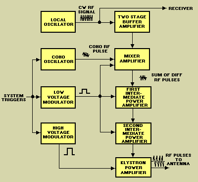 POWER-AMPLIFIER TRANSMITTER POWER-AMPLIFIER TRANSMITTERS are used in many recently developed radar sets. This type of transmitter was developed because of the need for more stable operation of the moving target indicator (mti). In a magnetron transmitting system, the high-power magnetron oscillator has a tendency to drift in frequency because of temperature variations, changes in the modulating pulse, and various other effects. Frequency drift is compensated for, in part, by the use of automatic frequency control (afc) circuits designed to control the frequency of the local oscillator in the receiver system. This, however, does not completely eliminate the undesirable effects of frequency drift on mti operation. The power-amplifier transmitter system does the same thing as the keyed-oscillator transmitter but with fewer stability problems. It generates, shapes, and amplifies pulses of rf energy for transmission. Figure 2-10 is a block diagram of a typical power-amplifier transmitter system. In this transmitter system a multicavity klystron tube amplifies lower-powered rf pulses that have been generated and shaped in other stages. CROSSED-FIELD AMPLIFIERS (AMPLITRONS) are used in radar systems with a wide band of transmitted frequencies because they are stable over a wider frequency range. A crossed-field amplifier transmitter is discussed later in this section. Figure 2-10. - Power amplifier transmitter block diagram.