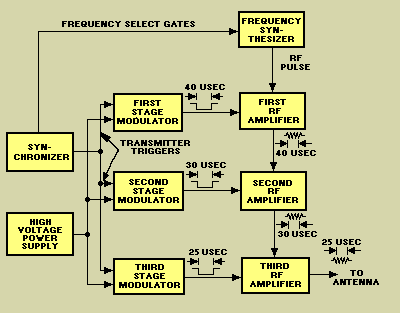 A typical frequency synthesizer consists of a bank of oscillators producing different fixed frequencies. The outputs of a relatively few fixed oscillators can be mixed in various combinations to produce a wide range of frequencies. In mti systems the selected oscillator frequencies are mixed with a coherent oscillator frequency to provide a stable reference for the mti circuits. The frequency synthesizer also produces the local oscillator signals for the receiver system. Because the transmitted pulse changes frequency on each transmission, the local oscillator signal to the receiver must also change and be included in the transmitted frequency. A system of this type is frequency-programmed by select gates from the synchronizer. The detailed operation of frequency synthesizers is beyond the scope of this manual but may be found in the technical manuals for most frequency scan radar systems. The first rf amplifier receives the pulses of the selected frequency from the synthesizer and a modulator pulse (from the first stage modulator) at the same time. The rf pulse is usually slightly wider than the modulator pulse which prevents the amplifier tube from pulsing when no rf energy is present. Most pulsed rf amplifiers will oscillate at an undesired frequency if pulsed without an rf input. The output of the first rf amplifier is an amplified rf pulse that is the same width as the first stage modulator pulse. The second stage modulator is designed to produce a pulse slightly narrower than the first stage modulator pulse; this also prevents the amplifier from pulsing when no rf is present. Therefore, the second stage amplifier receives a modulator pulse a short time after the first stage rf arrives at the input. As shown in figure 2-11, the same procedure is repeated in the third and final stage. The amplifiers in this type of power-amplifier transmitter must be broad-band microwave amplifiers that amplify the input signals without frequency distortion. Typically, the first stage and the second stage are traveling-wave tubes (twt) and the final stage is a crossed-field amplifier. Recent technological advances in the field of solid-state microwave amplifiers have produced solid-state amplifiers with enough output power to be used as the first stage in some systems. Transmitters with more than three stages usually use crossed-field amplifiers in the third and any additional stages. Both traveling-wave tubes and crossed-field amplifiers have a very flat amplification response over a relatively wide frequency range. Crossed-field amplifiers have another advantage when used as the final stages of a transmitter; that is, the design of the crossed-field amplifier allows rf energy to pass through the tube virtually unaffected when the tube is not pulsed. When no pulse is present, the tube acts as a section of waveguide. Therefore, if less than maximum output power is desired, the final and preceding cross-field amplifier stages can be shut off as needed. This feature also allows a transmitter to operate at reduced power, even when the final crossed-field amplifier is defective. Q.25 What transmitter component allows the radiation of a large number of discrete