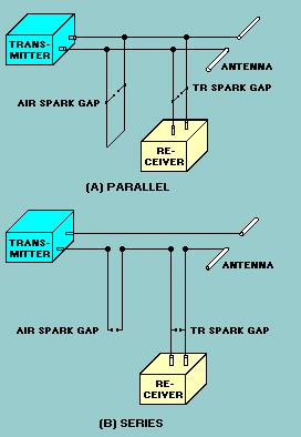 Therefore, a radar duplexer is the microwave equivalent of a fast, low-loss, single-pole, double-throw switch. The devices developed for this purpose are similar to spark gaps in which high-current microwave discharges furnish low-impedance paths. A duplexer usually contains two switching tubes (spark gaps) connected in a microwave circuit with three terminal transmission lines, one each for the transmitter, receiver, and antenna. As shown in views A and B of figure 2-12, these circuits may be connected in parallel or in series. Both systems will be discussed in detail in this section. One tube is called the TRANSMIT-RECEIVER TUBE, or TR TUBE; the other is called the ANTITRANSMIT-RECEIVE TUBE, or ATR TUBE. The tr tube has the primary function of disconnecting the receiver, and the atr tube of disconnecting the transmitter. Figure 2-12. - Duplexer systems.